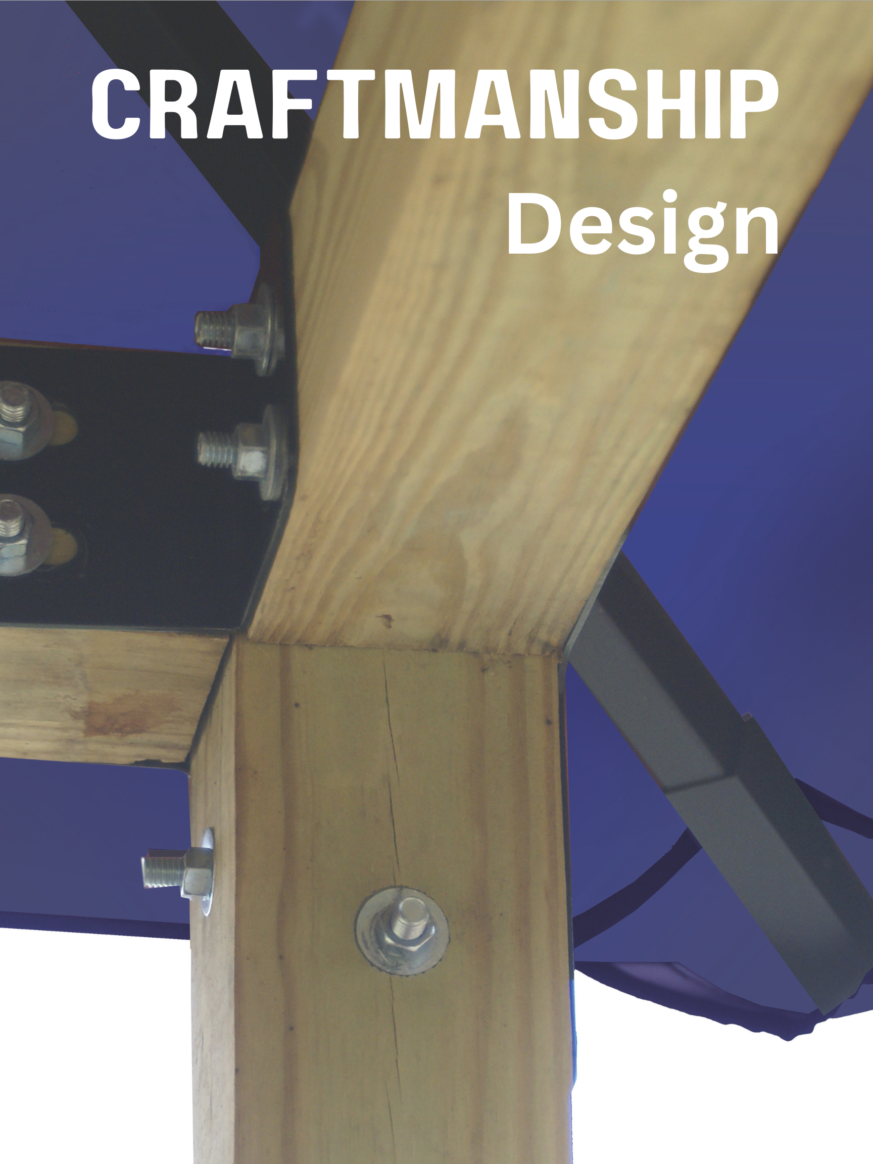 The gazebo roof framing is made with extruded aluminum and electrostatic finish actually sends an electric charge through the paint and the frame to help cause a chemical (ionic) bond, much stronger that simple powder coating commonly found in imported versions. The custom made steel brackets, carriage bolts, and hardware all have the same industrial powder coating finish.