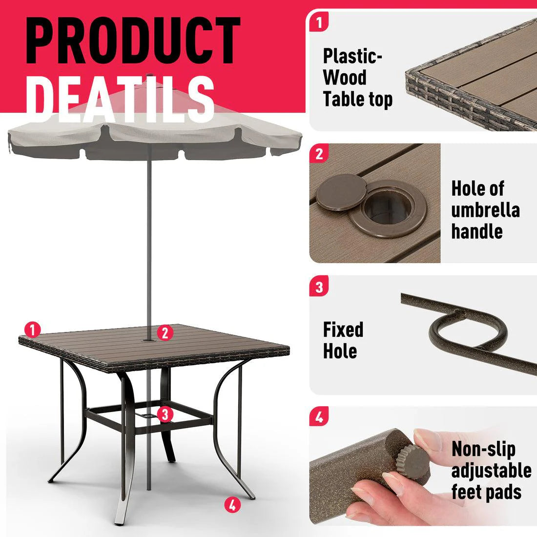 - 1 Square Table: 36.8" x 36.8" with a plastic-wood tabletop that’s easy to clean and built to handle the elements.