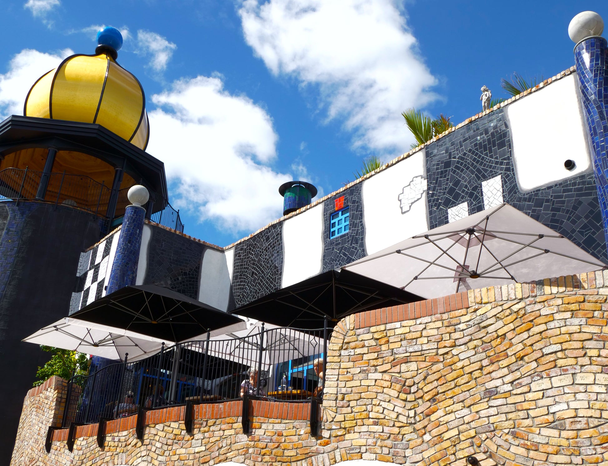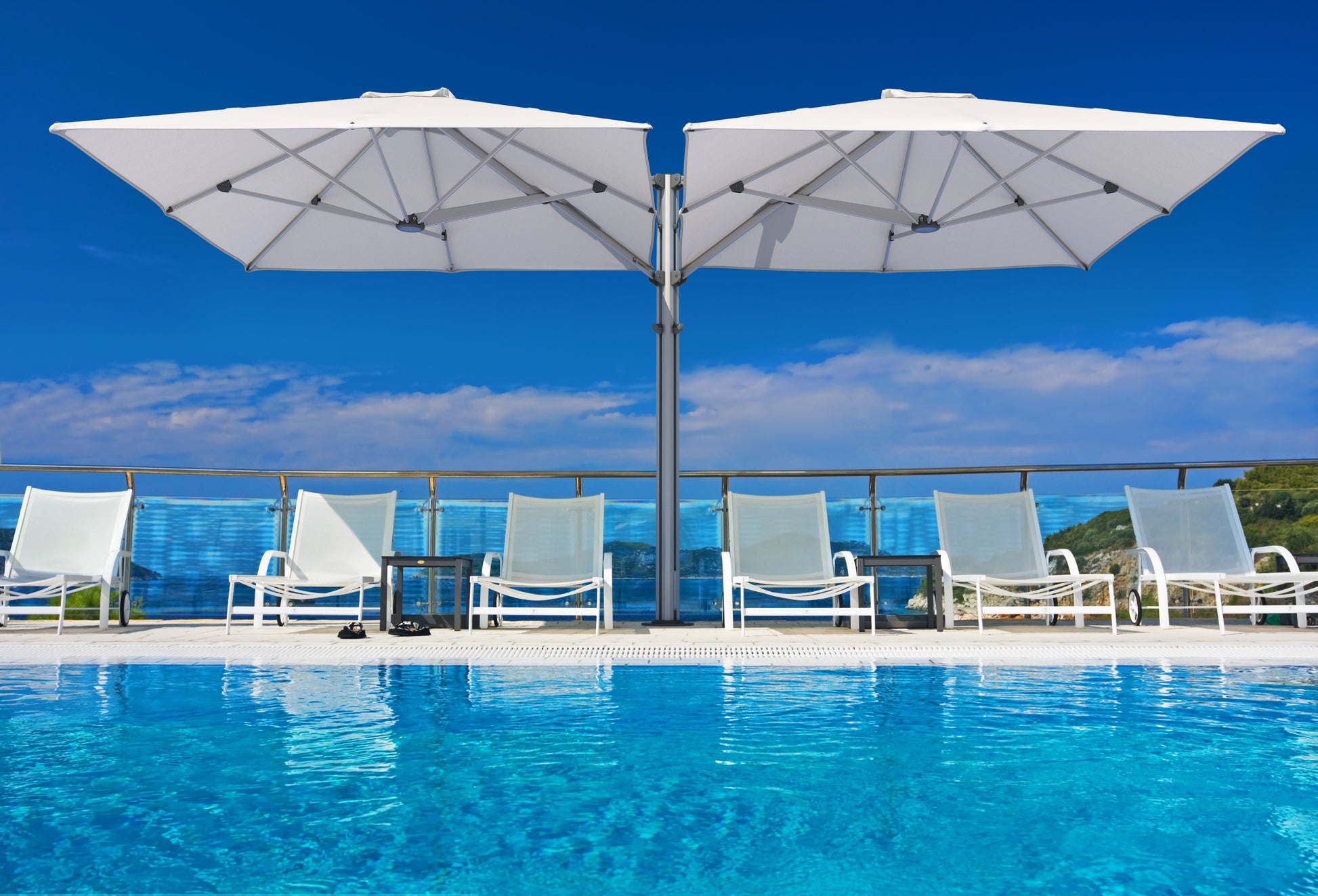 The integrated wind-protection and umbrella rotation system allows for all-day protection from the elements and 360-degree rotation of the umbrellas.