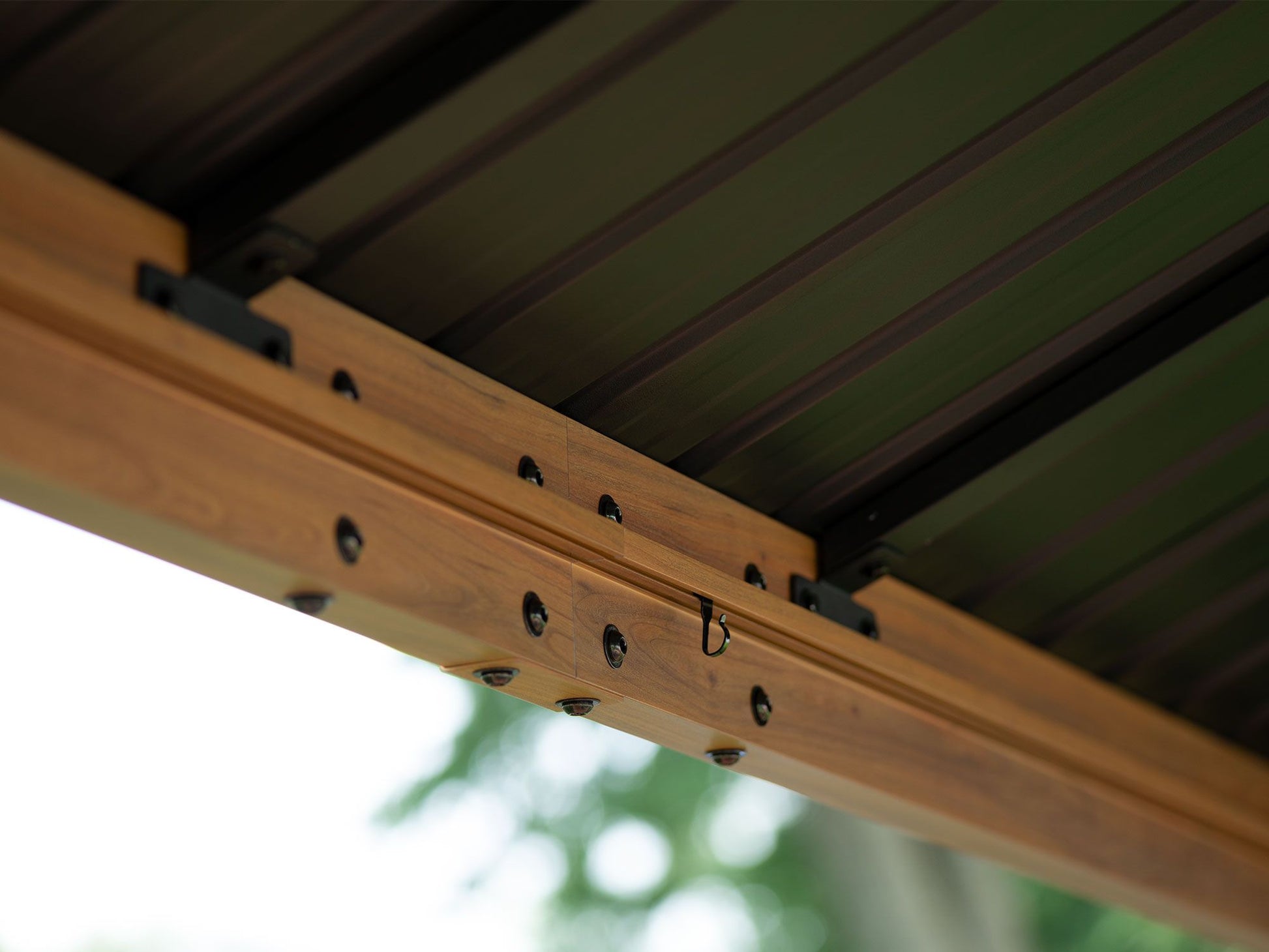 - Crafted with a sturdy aluminum frame, this gazebo boasts exceptional durability and resistance to the elements. Our reinforced roof is made of 0.45 mm galvanized steel and is UV protected. The wood powder coated finish adds a touch of natural warmth, making it a perfect fusion of strength and style. Rest assured, this gazebo is built to withstand the test of time.